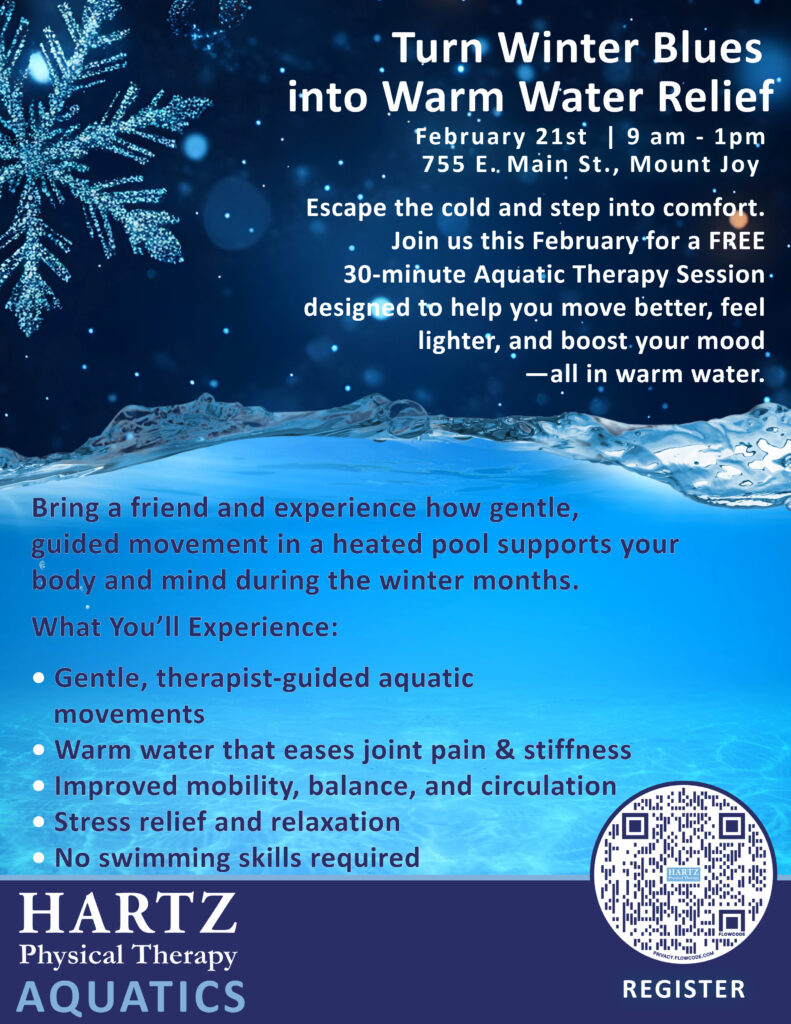 Winter can make movement feel harder—especially when joints are stiff, pain flares, or motivation dips. This February, we’re inviting you to step out of the cold and into comfort with a FREE 30-minute Aquatic Therapy Trial Session at HARTZ Physical Therapy in Mount Joy.